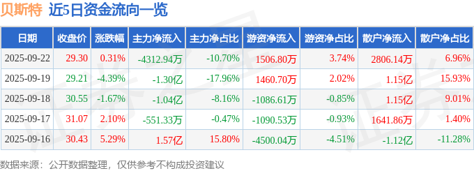 证券之星消息,截至2025年9月22日收盘,贝斯特(300580)报收于29.3元,上涨0.31%,换手率2.93%,成交量13.77万手,成交额4.03亿元。