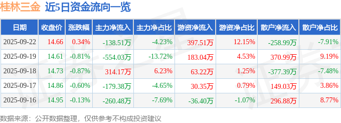 9月22日的资金流向数据方面,主力资金净流出138.51万元,占总成交额4.23%,游资资金净流入397.51万元,占总成交额12.15%,散户资金净流出258.99万元,占总成交额7.91%。