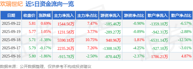 证券之星消息,截至2025年9月22日收盘,欢瑞世纪(000892)报收于5.81元,上涨0.69%,换手率5.06%,成交量35.97万手,成交额2.07亿元。