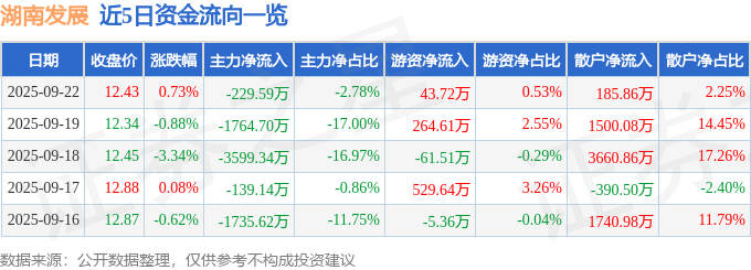 证券之星消息,截至2025年9月22日收盘,湖南发展(000722)报收于12.43元,上涨0.73%,换手率1.45%,成交量6.72万手,成交额8270.36万元。