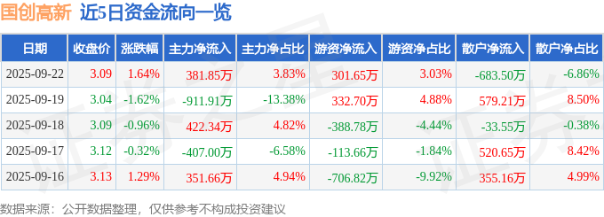 证券之星消息,截至2025年9月22日收盘,国创高新(002377)报收于3.09元,上涨1.64%,换手率3.68%,成交量32.14万手,成交额9964.27万元。
