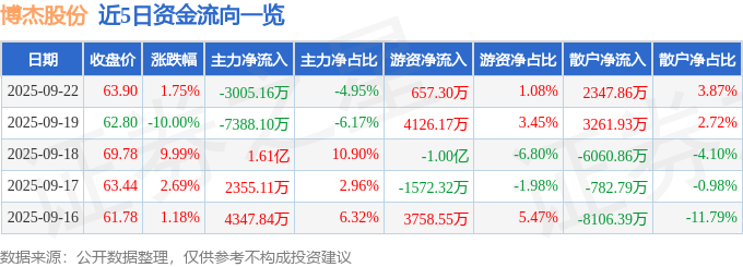 证券之星消息,截至2025年9月22日收盘,博杰股份(002975)报收于63.9元,上涨1.75%,换手率9.03%,成交量9.56万手,成交额6.07亿元。