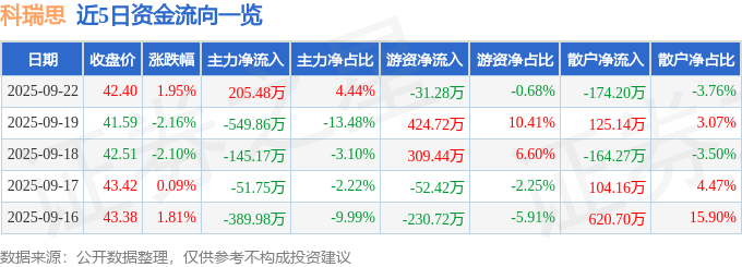 证券之星消息,截至2025年9月22日收盘,科瑞思(301314)报收于42.4元,上涨1.95%,换手率6.73%,成交量1.09万手,成交额4630.85万元。