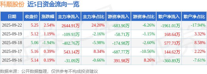 证券之星消息,截至2025年9月22日收盘,科顺股份(300737)报收于5.25元,上涨2.54%,换手率2.39%,成交量21.23万手,成交额1.09亿元。