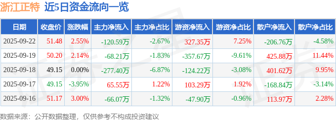 证券之星消息,截至2025年9月22日收盘,浙江正特(001238)报收于51.48元,上涨2.55%,换手率0.85%,成交量8812.0手,成交额4514.91万元。