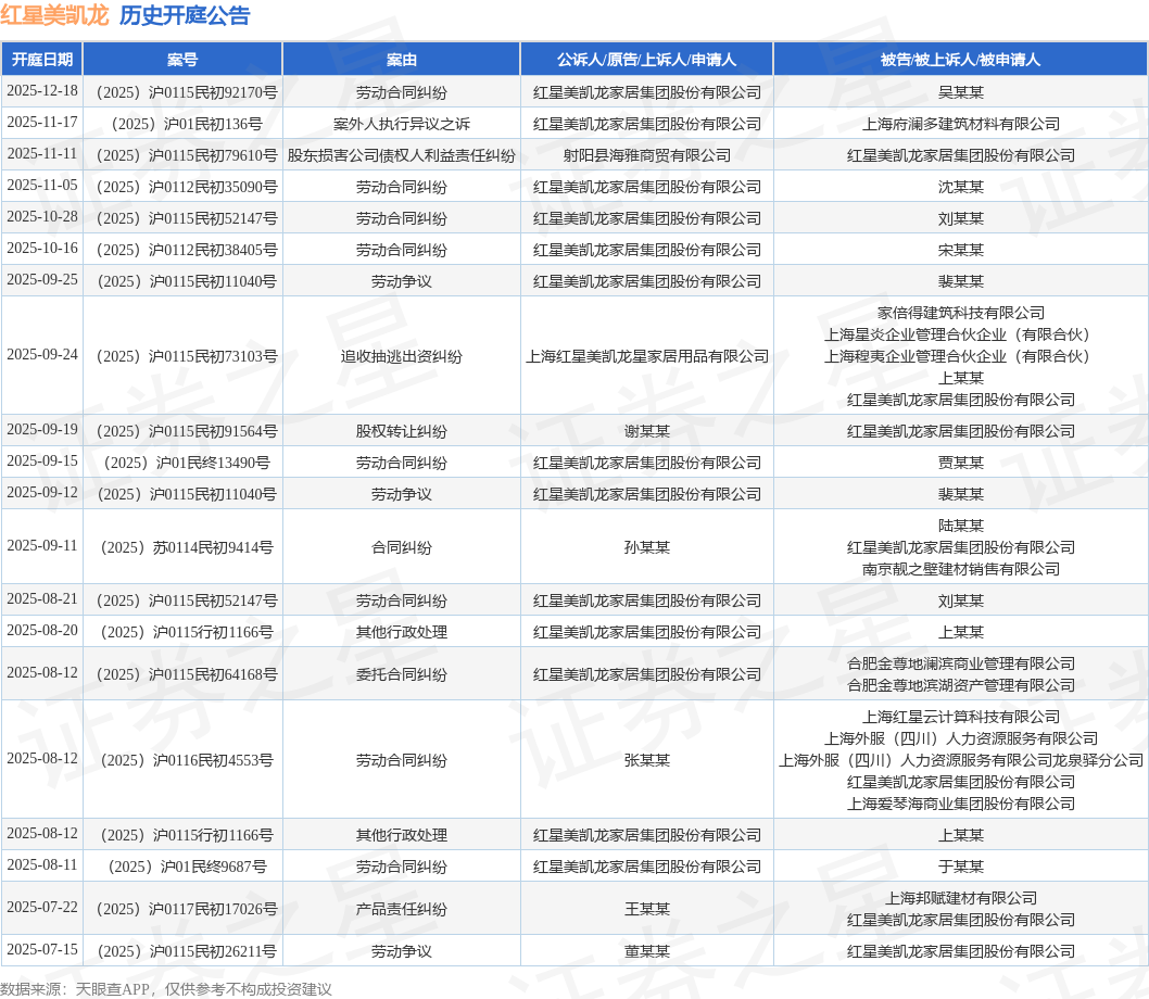 案号:(2025)沪0115民初11040号根据统计,近一年内以红星美凯龙家居集团股份有限公司为当事人的历史开庭公告有77则,其中案由为“劳动合同纠纷”的公告以22则居首,其次为“劳动争议”有10则,“租赁合同纠纷”有7则。历史开庭公告(前20条)如下: