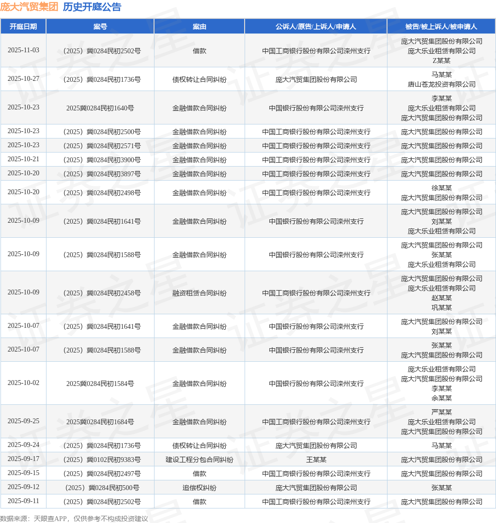 案号:2025冀0284民初1684号根据统计,近一年内以庞大汽贸集团股份有限公司为当事人的历史开庭公告有138则,其中案由为“金融借款合同纠纷”的公告以74则居首,其次为“劳动争议”有15则,“借款”有13则。历史开庭公告(前20条)如下: