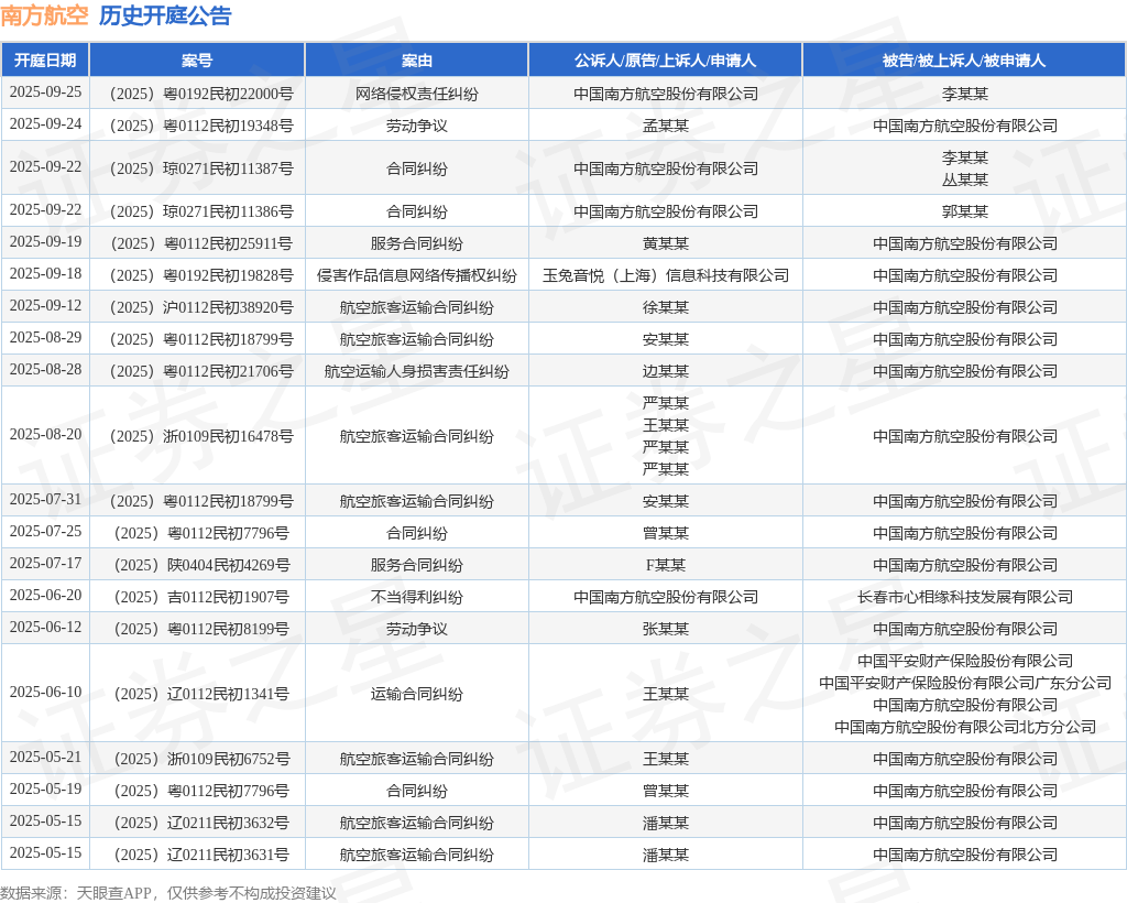 案号:(2025)粤0192民初22000号根据统计,近一年内以中国南方航空股份有限公司为当事人的历史开庭公告有57则,其中案由为“航空旅客运输合同纠纷”的公告以17则居首,其次为“著作权权属纠纷”有9则,“合同纠纷”有8则。历史开庭公告(前20条)如下: