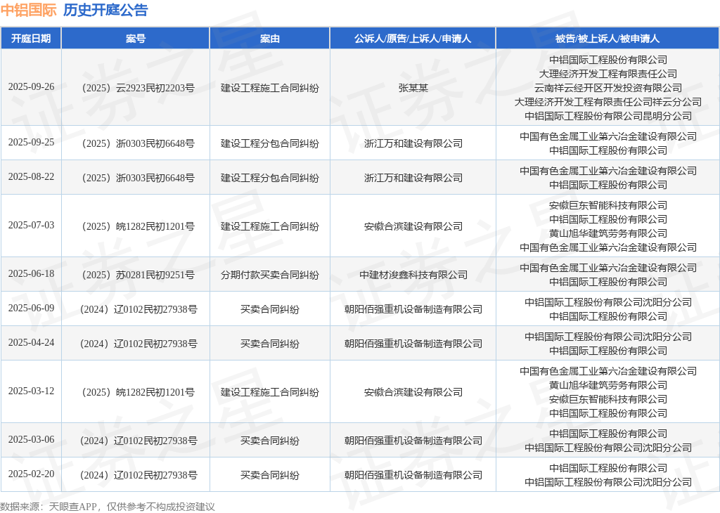 案号:(2025)浙0303民初6648号根据统计,近一年内以中铝国际工程股份有限公司为当事人的历史开庭公告有10则,其中案由为“买卖合同纠纷”的公告以4则居首,其次为“建设工程施工合同纠纷”有3则,“建设工程分包合同纠纷”有2则。历史开庭公告如下: