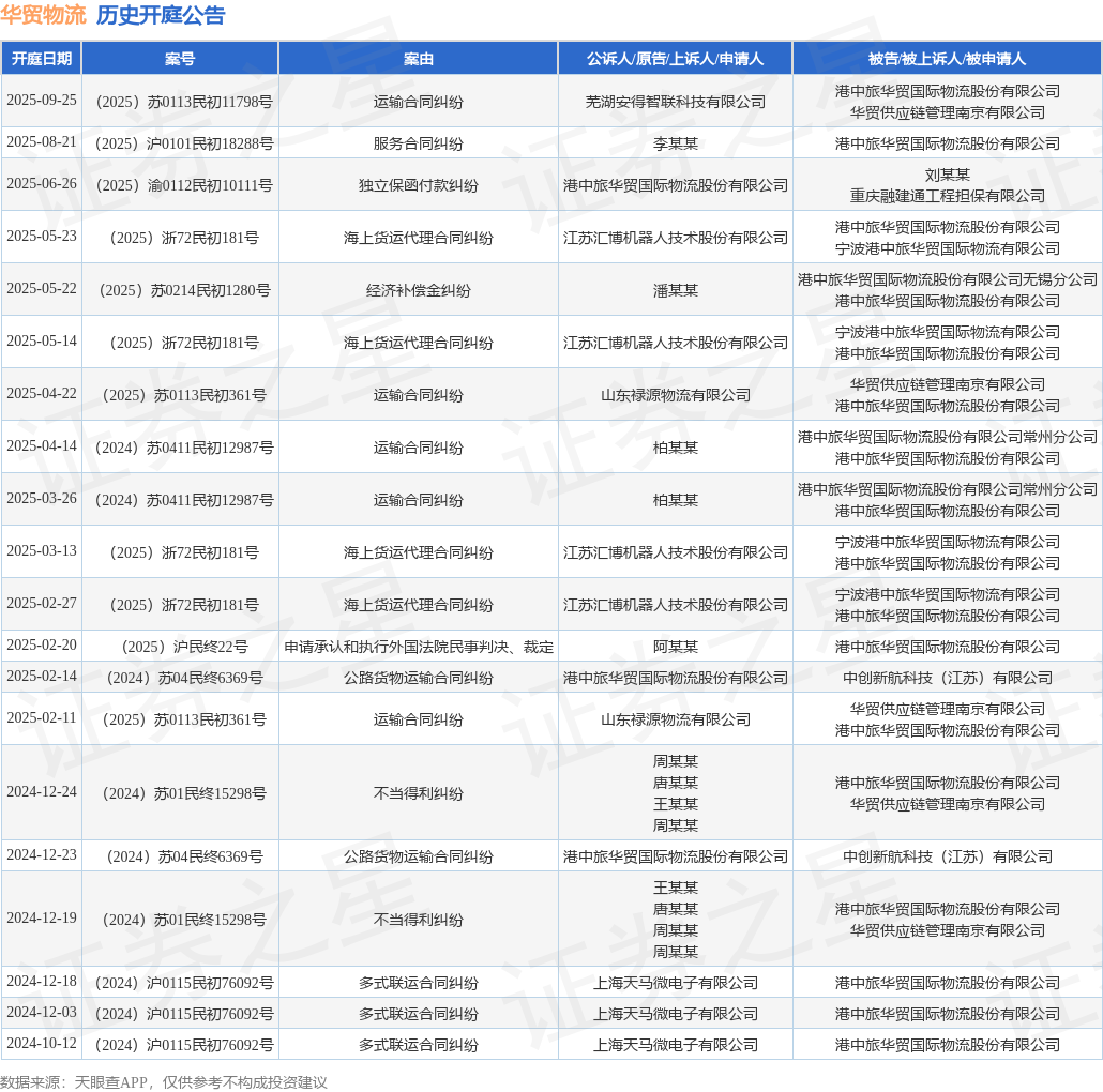 案号:(2025)苏0113民初11798号根据统计,近一年内以港中旅华贸国际物流股份有限公司为当事人的历史开庭公告有22则,其中案由为“运输合同纠纷”的公告以5则居首,其次为“海上货运代理合同纠纷”有4则,“不当得利纠纷”有3则。历史开庭公告(前20条)如下: