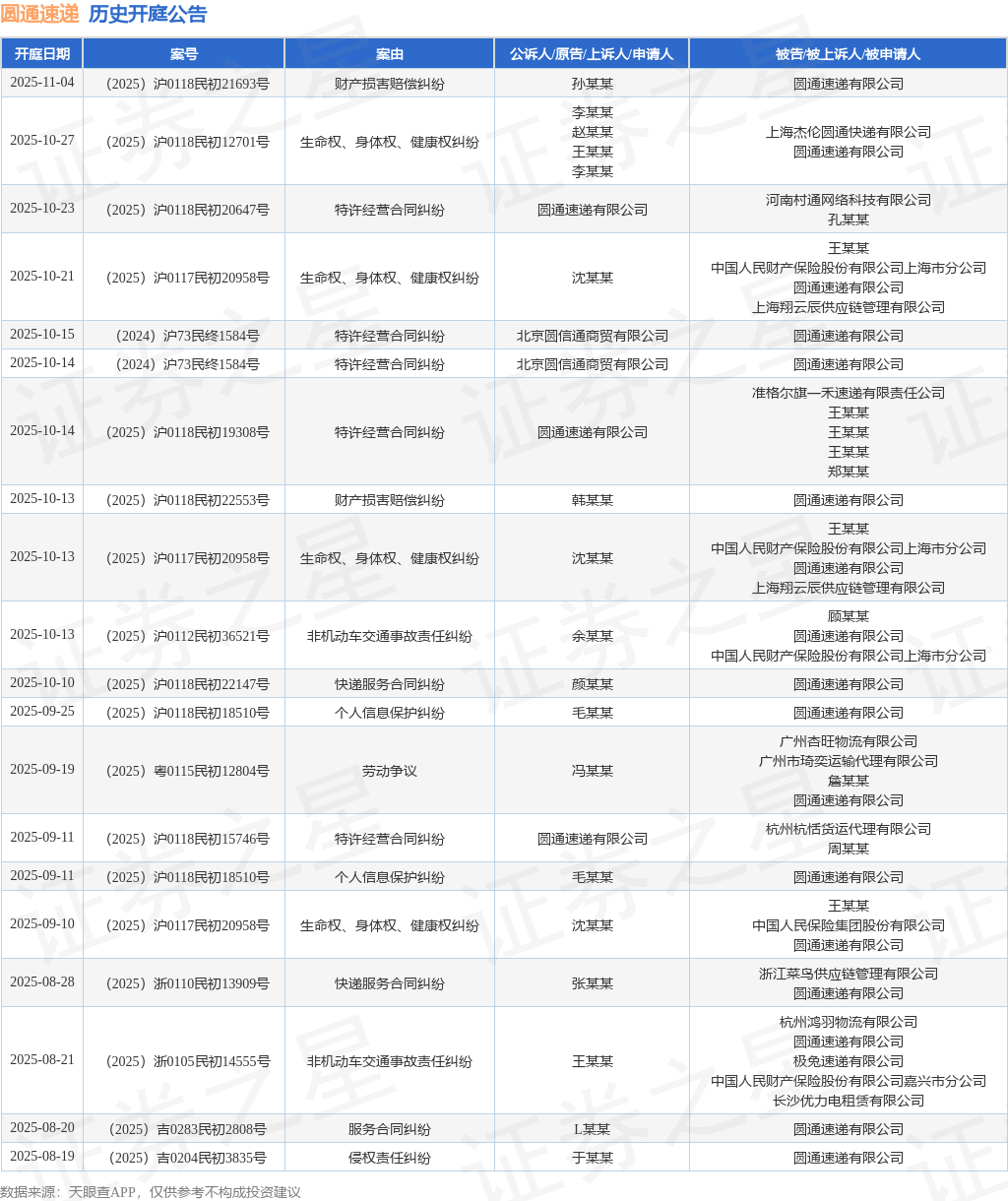 案号:(2025)沪0118民初18510号根据统计,近一年内以圆通速递有限公司为当事人的历史开庭公告有157则,其中案由为“快递服务合同纠纷”的公告以35则居首,其次为“特许经营合同纠纷”有27则,“机动车交通事故责任纠纷”有14则。历史开庭公告(前20条)如下: