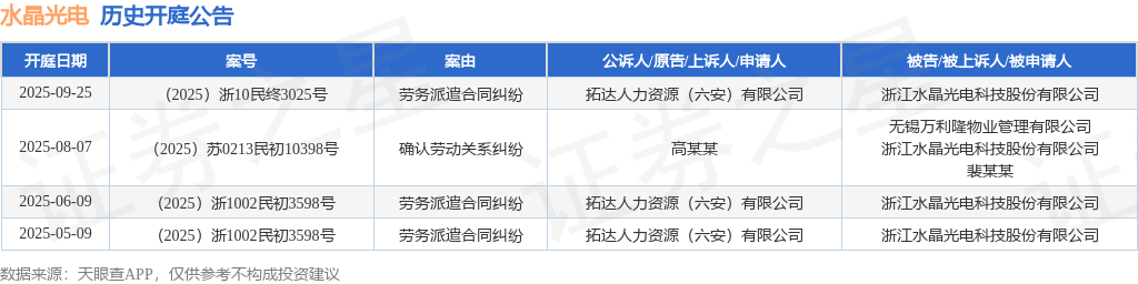 根据统计,近一年内以浙江水晶光电科技股份有限公司为当事人的历史开庭公告有4则,其中案由为“劳务派遣合同纠纷”的公告以3则居首,其次为“确认劳动关系纠纷”有1则。历史开庭公告如下: