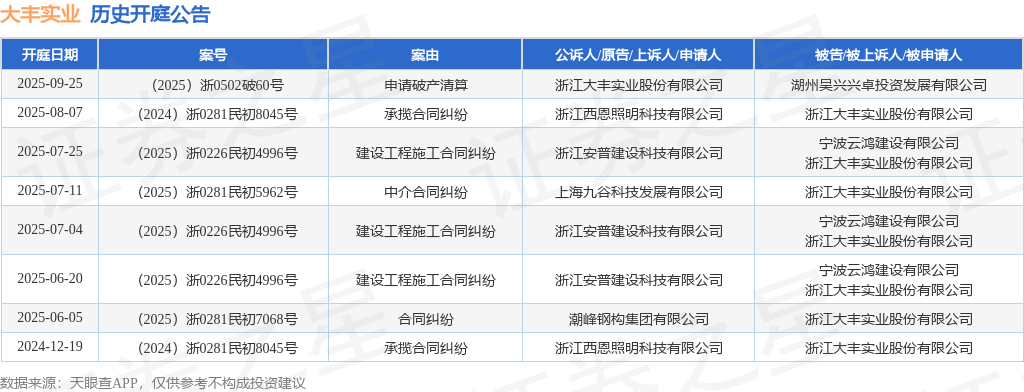 案号:(2025)浙0502破60号根据统计,近一年内以浙江大丰实业股份有限公司为当事人的历史开庭公告有8则,其中案由为“建设工程施工合同纠纷”的公告以3则居首,其次为“承揽合同纠纷”有2则,“中介合同纠纷”有1则。历史开庭公告如下: