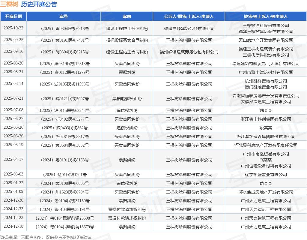 案号:(2025)冀0191民初7401号根据统计,近一年内以三棵树涂料股份有限公司为当事人的历史开庭公告有30则,其中案由为“票据纠纷”的公告以10则居首,其次为“买卖合同纠纷”有8则,“追偿权纠纷”有3则。历史开庭公告(前20条)如下: