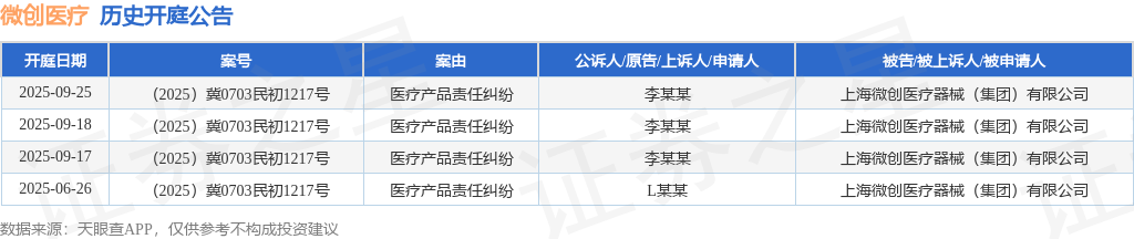 根据统计,近一年内以上海微创医疗器械(集团)有限公司为当事人的历史开庭公告有4则,其中案由为“医疗产品责任纠纷”的公告以4则居首。历史开庭公告如下: