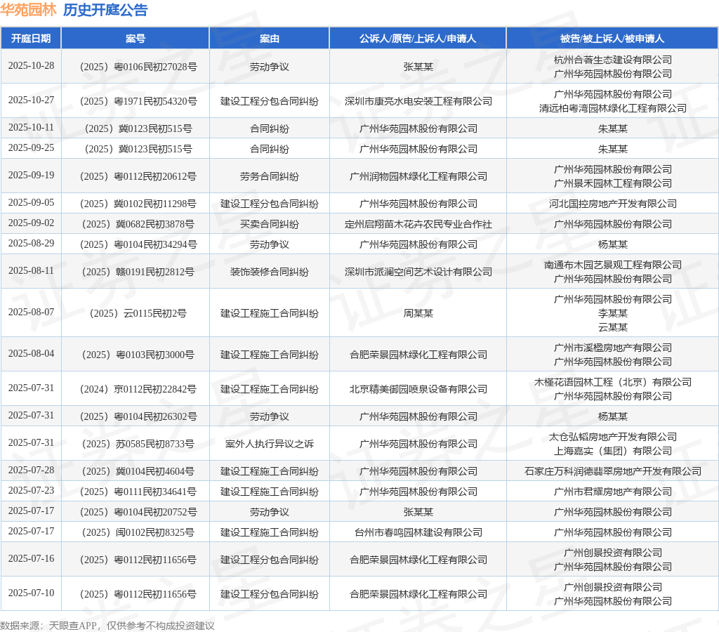 案号:(2025)冀0123民初515号根据统计,近一年内以广州华苑园林股份有限公司为当事人的历史开庭公告有113则,其中案由为“建设工程施工合同纠纷”的公告以42则居首,其次为“买卖合同纠纷”有16则,“建设工程分包合同纠纷”有12则。历史开庭公告(前20条)如下: