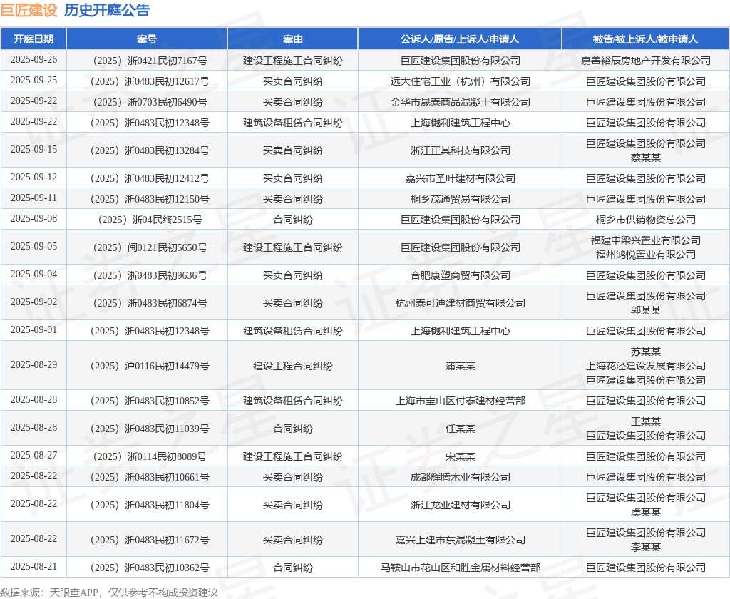案号:(2025)浙0483民初12617号根据统计,近一年内以巨匠建设集团股份有限公司为当事人的历史开庭公告有249则,其中案由为“买卖合同纠纷”的公告以83则居首,其次为“合同纠纷”有39则,“建设工程施工合同纠纷”有38则。历史开庭公告(前20条)如下: