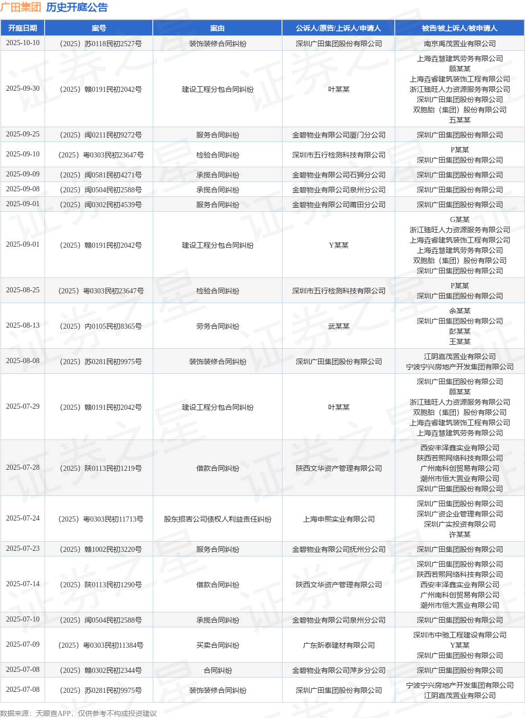 案号:(2025)闽0211民初9272号根据统计,近一年内以深圳广田集团股份有限公司为当事人的历史开庭公告有74则,其中案由为“建设工程分包合同纠纷”的公告以10则居首,其次为“装饰装修合同纠纷”有8则,“劳务合同纠纷”有8则。历史开庭公告(前20条)如下: