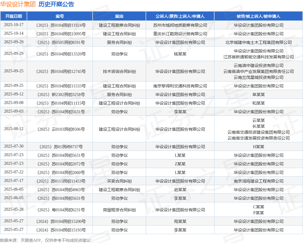 案号:(2025)苏0104民初11533号根据统计,近一年内以华设设计集团股份有限公司为当事人的历史开庭公告有65则,其中案由为“劳动争议”的公告以28则居首,其次为“建设工程设计合同纠纷”有9则,“买卖合同纠纷”有5则。历史开庭公告(前20条)如下:
