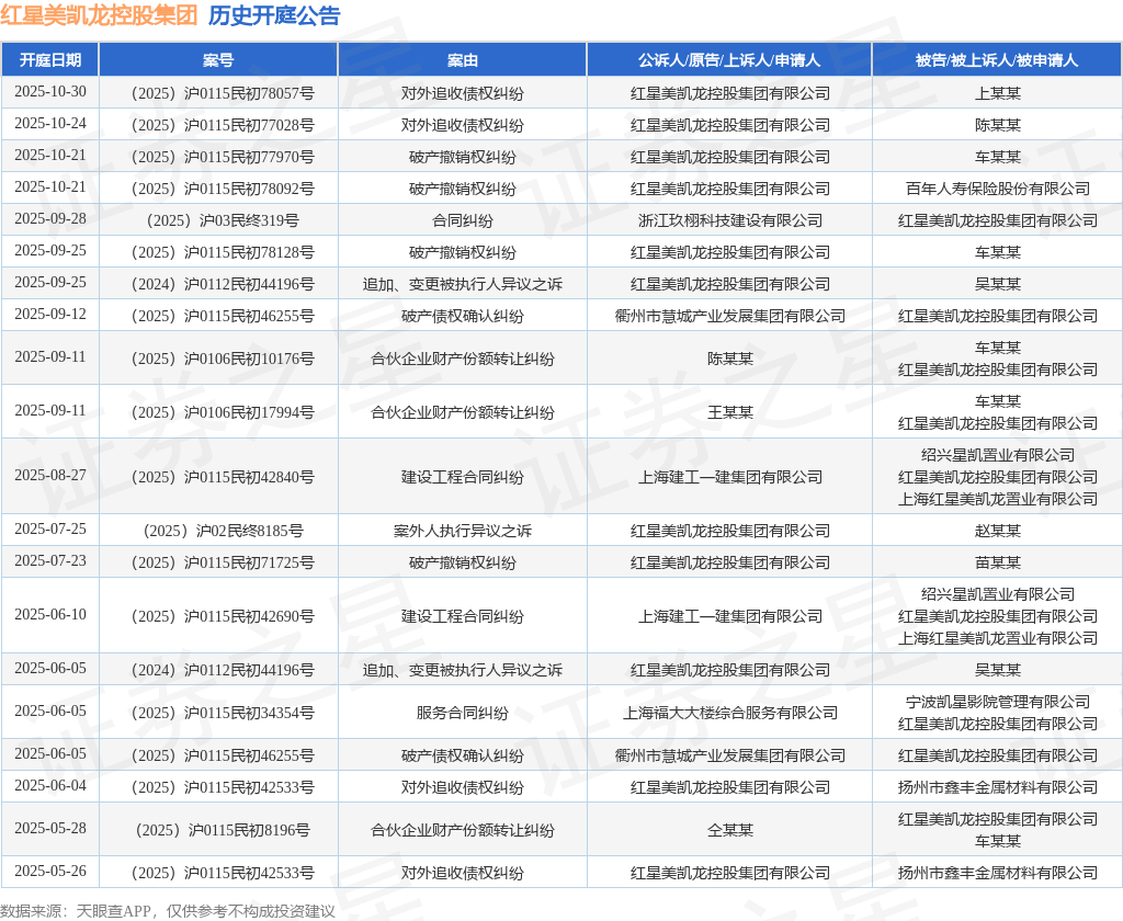 案号:(2024)沪0112民初44196号根据统计,近一年内以红星美凯龙控股集团有限公司为当事人的历史开庭公告有57则,其中案由为“合伙企业财产份额转让纠纷”的公告以12则居首,其次为“破产债权确认纠纷”有7则,“合同纠纷”有5则。历史开庭公告(前20条)如下: