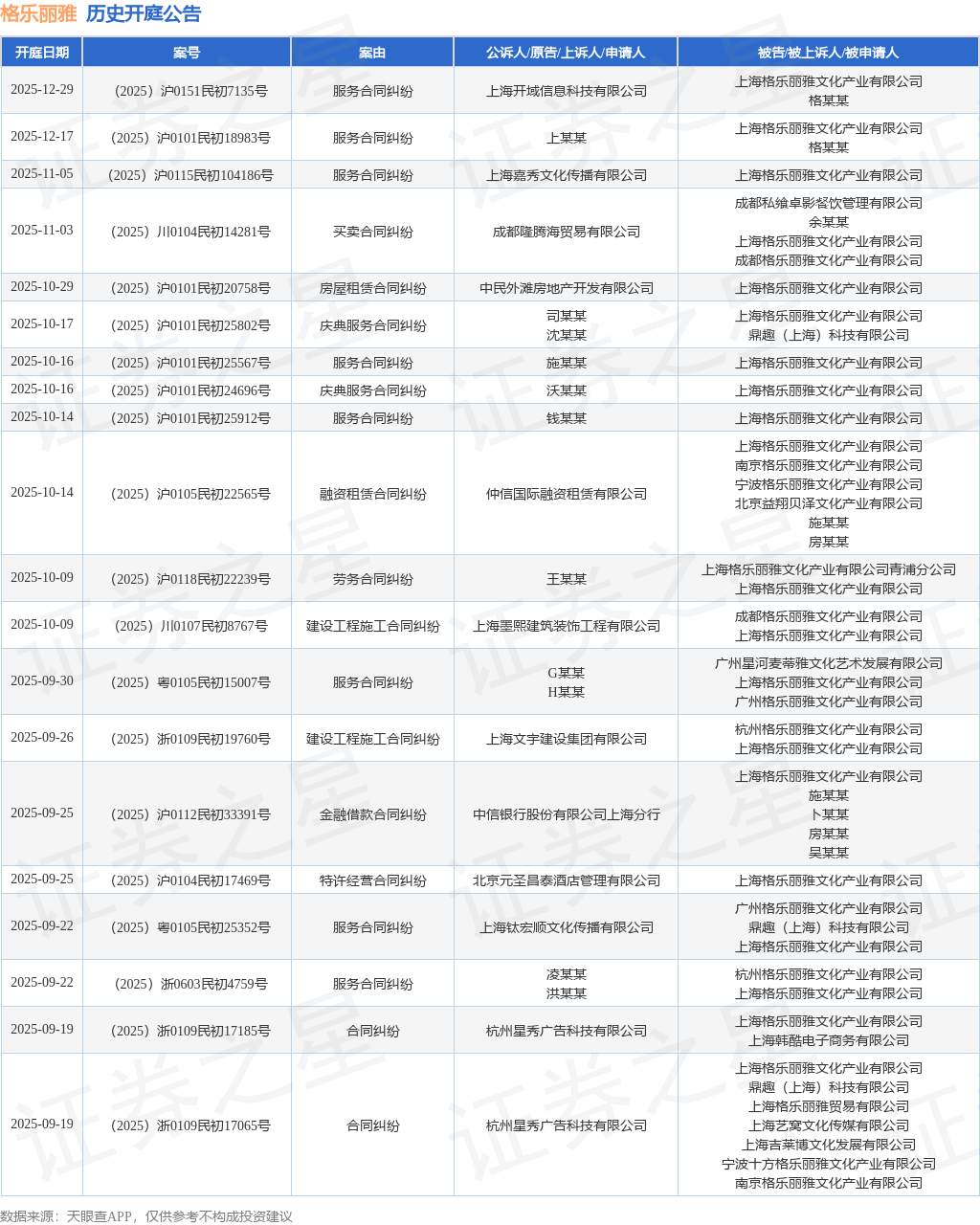 案号:(2025)沪0112民初33391号根据统计,近一年内以上海格乐丽雅文化产业有限公司为当事人的历史开庭公告有201则,其中案由为“服务合同纠纷”的公告以52则居首,其次为“买卖合同纠纷”有50则,“合同纠纷”有23则。历史开庭公告(前20条)如下: