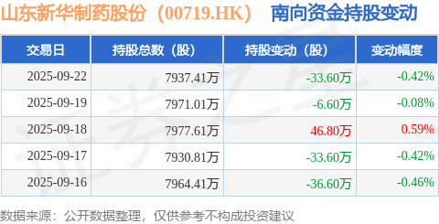 证券之星消息,9月22日南向资金减持33.6万股山东新华制药股份(00719.HK)。近5个交易日中,获南向资金减持的有4天,累计净减持63.6万股。近20个交易日中,获南向资金减持的有16天,累计净减持352.06万股。截至目前,南向资金持有山东新华制药股份(00719.HK)7937.41万股,占公司已发行普通股的40.7%。