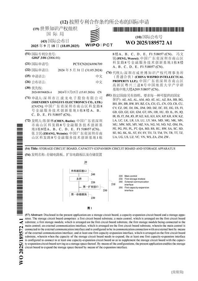 证券之星消息,根据企查查数据显示江波龙(301308)公布了一项国际专利申请,专利名为“存储电路板、扩容电路板以及存储装置”,专利申请号为PCT/CN2024/096709,国际公布日为2025年9月18日。
