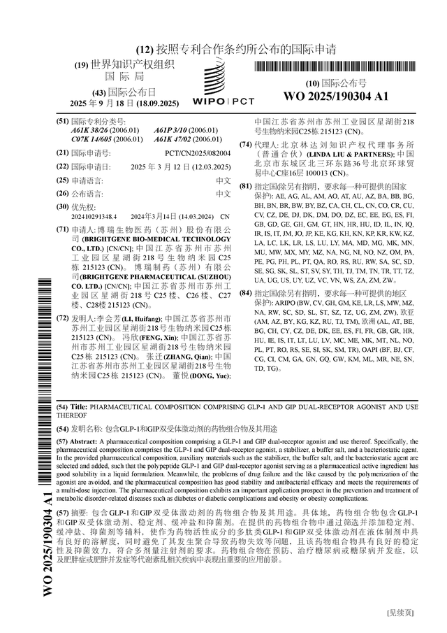 证券之星消息,根据企查查数据显示博瑞医药(688166)公布了一项国际专利申请,专利名为“包含GLP-1和GIP双受体激动剂的药物组合物及其用途”,专利申请号为PCT/CN2025/082004,国际公布日为2025年9月18日。