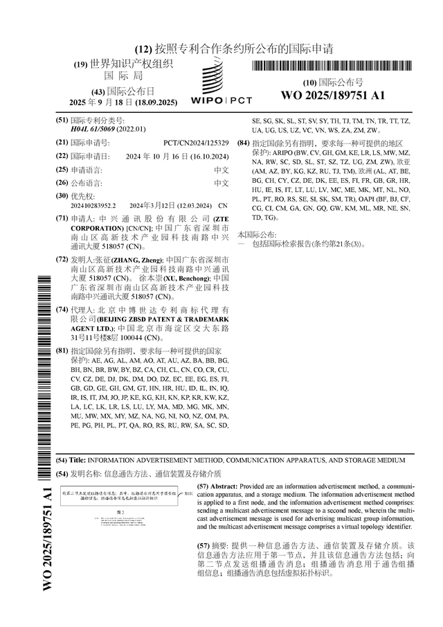 证券之星消息,根据企查查数据显示中兴通讯(000063)公布了一项国际专利申请,专利名为“信息通告方法、通信装置及存储介质”,专利申请号为PCT/CN2024/125329,国际公布日为2025年9月18日。