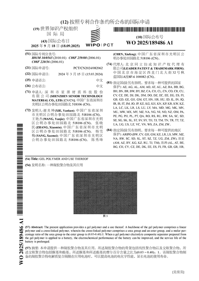 证券之星消息,根据企查查数据显示星源材质(300568)公布了一项国际专利申请,专利名为“一种凝胶聚合物及其应用”,专利申请号为PCT/CN2024/082062,国际公布日为2025年9月18日。