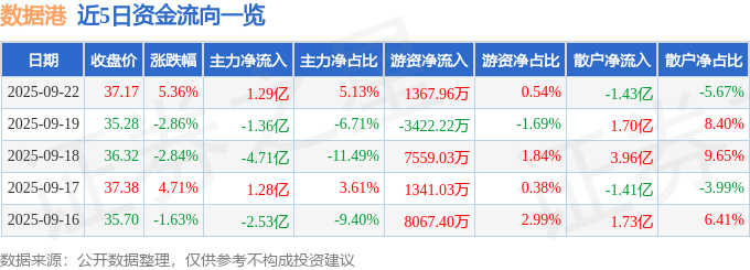 证券之星消息,截至2025年9月22日收盘,数据港(603881)报收于37.17元,上涨5.36%,换手率9.59%,成交量68.91万手,成交额25.24亿元。