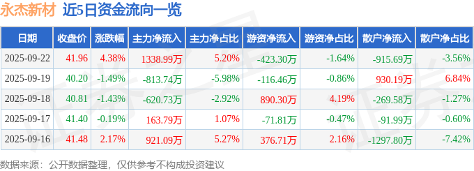 证券之星消息,截至2025年9月22日收盘,永杰新材(603271)报收于41.96元,上涨4.38%,换手率15.72%,成交量6.19万手,成交额2.57亿元。