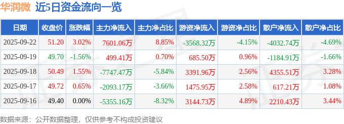 证券之星消息,截至2025年9月22日收盘,华润微(688396)报收于51.2元,上涨3.02%,换手率1.28%,成交量16.98万手,成交额8.59亿元。