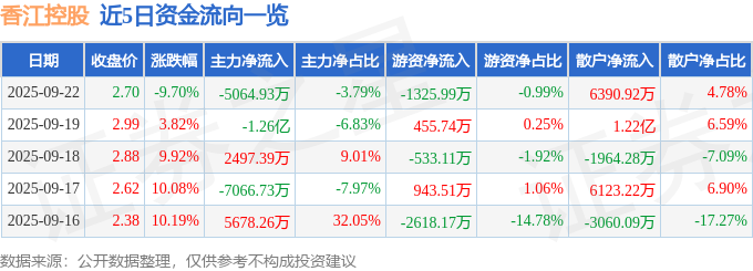 证券之星消息,截至2025年9月22日收盘,香江控股(600162)报收于2.7元,下跌9.7%,换手率14.95%,成交量488.62万手,成交额13.36亿元。