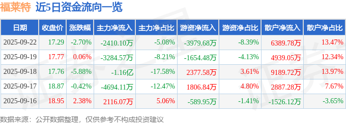 证券之星消息,截至2025年9月22日收盘,福莱特(601865)报收于17.29元,下跌2.7%,换手率1.45%,成交量27.55万手,成交额4.74亿元。