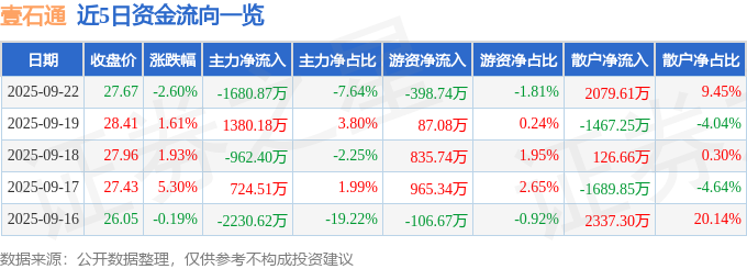 证券之星消息,截至2025年9月22日收盘,壹石通(688733)报收于27.67元,下跌2.6%,换手率3.98%,成交量7.95万手,成交额2.2亿元。