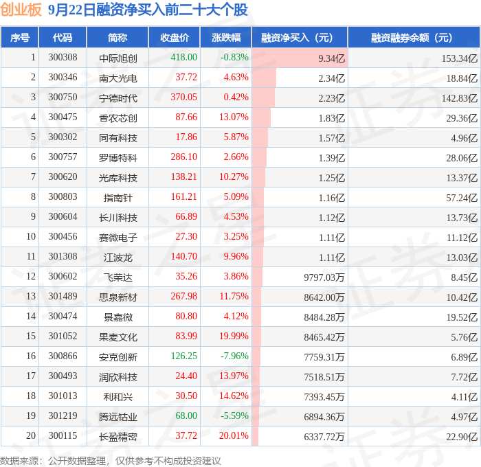 创业板融资净买入前三分别为:中际旭创(300308)融资净买入9.34亿元、南大光电(300346)融资净买入2.34亿元、宁德时代(300750)融资净买入2.23亿元,前20具体见下表: