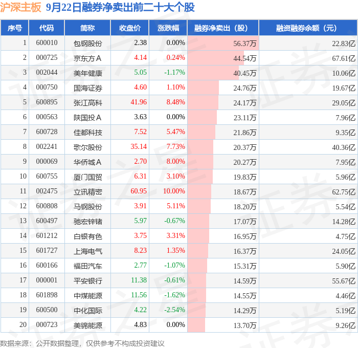 沪深主板融券净卖出前三分别为:包钢股份(600010)融券净卖出56.37万股、京东方A(000725)融券净卖出44.54万股、美年健康(002044)融券净卖出40.45万股,前20具体见下表:
