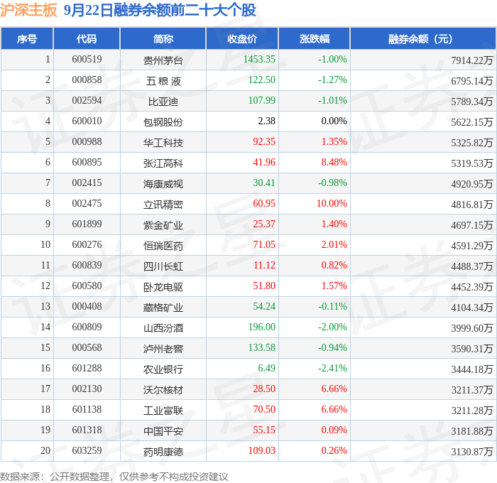 沪深主板融券余额前三分别为:贵州茅台(600519)融券余额7914.22万元、五 粮 液(000858)融券余额6795.14万元、比亚迪(002594)融券余额5789.34万元,前20具体见下表: