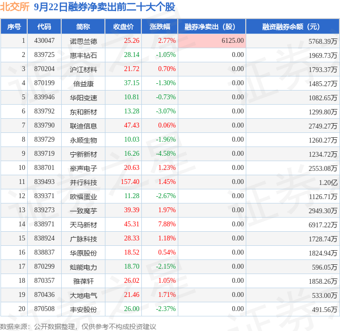 北交所融券净卖出前三分别为:诺思兰德(430047)融券净卖出6125股,前20具体见下表:
