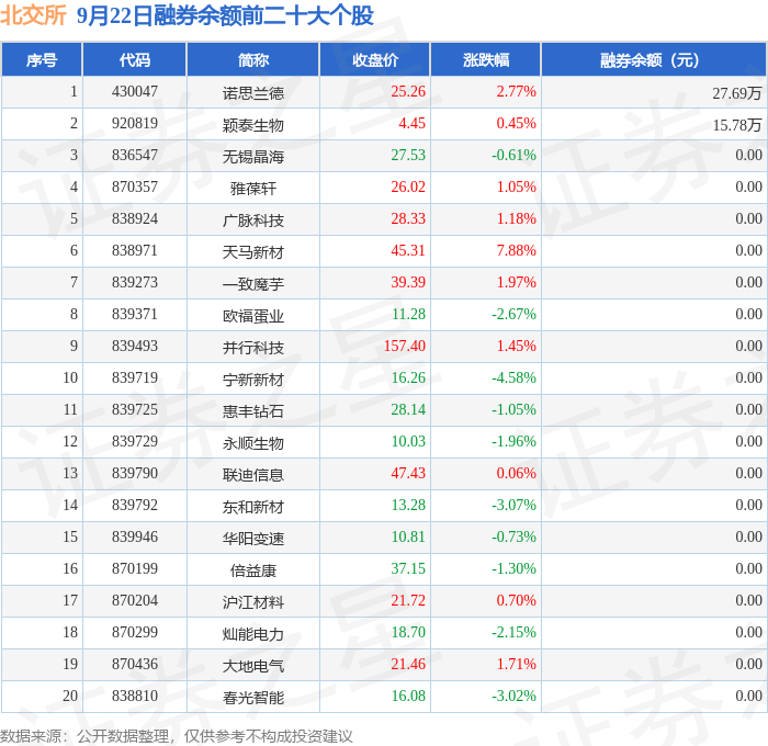 北交所融券余额前三分别为:诺思兰德(430047)融券余额27.69万元、颖泰生物(920819)融券余额15.78万元,前20具体见下表: