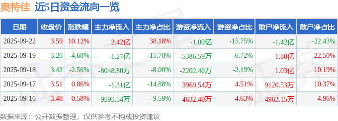 证券之星消息,截至2025年9月22日收盘,奥特佳(002239)报收于3.59元,上涨10.12%,涨停,换手率5.58%,成交量180.96万手,成交额6.35亿元。