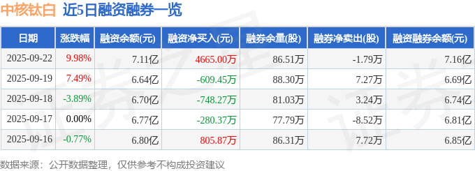 中核钛白融资融券信息显示,融资方面,当日融资买入2.54亿元,融资偿还2.08亿元,融资净买入4665.0万元。融券方面,融券卖出6900.0股,融券偿还2.48万股,融券余量86.51万股,融券余额505.22万元。融资融券余额7.16亿元。