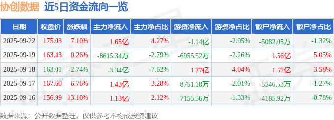 证券之星消息,截至2025年9月22日收盘,协创数据(300857)报收于175.03元,上涨7.1%,换手率6.47%,成交量22.32万手,成交额38.56亿元。