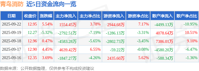 证券之星消息,截至2025年9月22日收盘,青鸟消防(002960)报收于12.95元,上涨5.54%,换手率4.32%,成交量32.07万手,成交额4.11亿元。