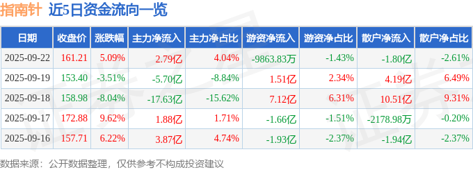 证券之星消息,截至2025年9月22日收盘,指南针(300803)报收于161.21元,上涨5.09%,换手率7.28%,成交量43.57万手,成交额69.0亿元。