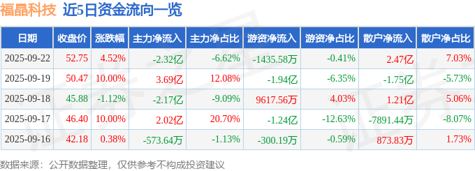 证券之星消息,截至2025年9月22日收盘,福晶科技(002222)报收于52.75元,上涨4.52%,换手率14.05%,成交量65.79万手,成交额35.1亿元。