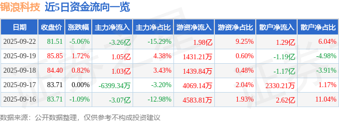 证券之星消息,截至2025年9月22日收盘,锦浪科技(300763)报收于81.51元,下跌5.06%,换手率8.03%,成交量25.82万手,成交额21.35亿元。