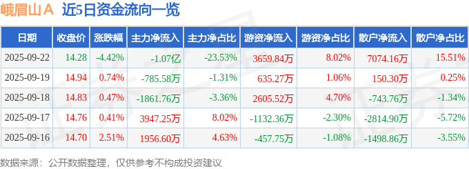 证券之星消息,截至2025年9月22日收盘,峨眉山A(000888)报收于14.28元,下跌4.42%,换手率6.0%,成交量31.59万手,成交额4.56亿元。