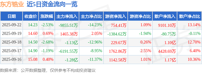 9月22日的资金流向数据方面,主力资金净流出9855.51万元,占总成交额14.23%,游资资金净流入754.41万元,占总成交额1.09%,散户资金净流入9101.1万元,占总成交额13.14%。
